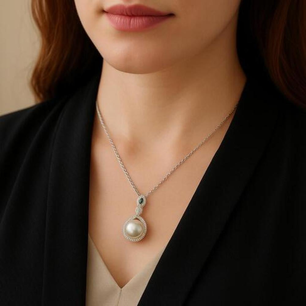 سلسال فاخر بتصميم كلاسيكي راقٍ، مزين بتعليقة لؤلؤة أنثوية كبيرة تتدلى بأناقة من سلسلة معدنية لامعة، ليمنحك إطلالة ملكية تلفت الأنظار.