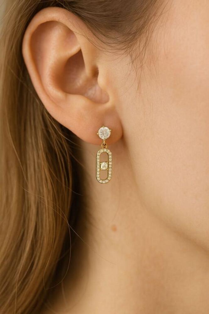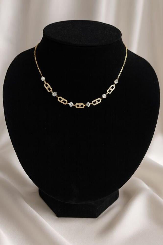 طقم ذهبي مرصع بزركون لامع بتصميم عصري يجمع بين العقد والحلق المتناسقين. إطلالة مترفة تزيدك بريقًا وأناقة.