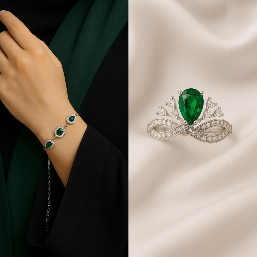 • خاتم زمردي فاخر بتصميم راقٍ يبرز جمال الحجر الأخضر وسط لمعة الفصوص البراقة